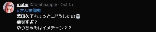 2024年10月の『踊る!さんま御殿!!』での出演時には、派手な衣装と若作りメイクが話題になりました。