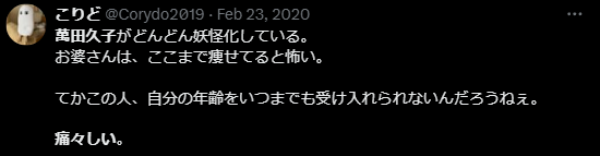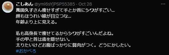 この極端な痩せ方は、頬のこけや首のシワを強調する結果となっているのかもしれません。