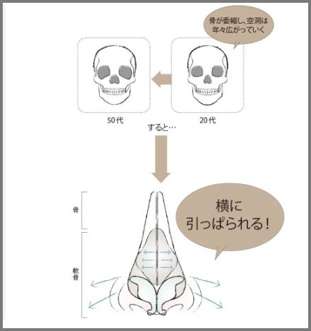 - 年齢を重ねて骨の量が減少し、鼻がある頭蓋骨も萎縮して空洞が広がり、鼻が引っ張られて広がる