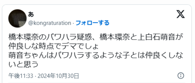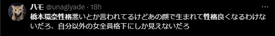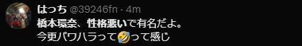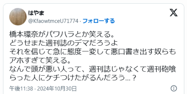 2024年10月30日に「週刊文春」が報じた内容によると、橋本は撮影現場でマネージャーに対して激しい暴言を吐くなどの行動があったとされています。