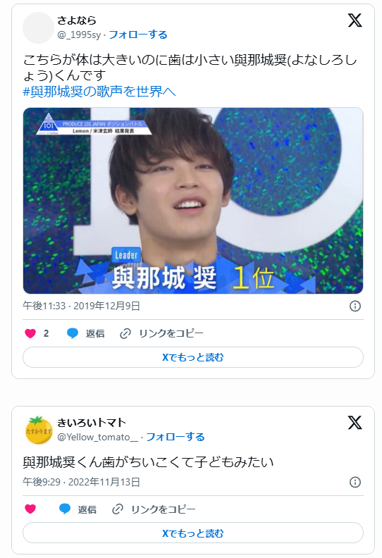 しかし、與那城奨さんについて「歯が気になる」「笑った時の口元に違和感がある」という声もあるようです。
