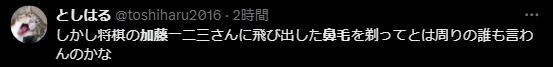SNS上では、加藤一二三さんの鼻毛について、このような意見があります↓