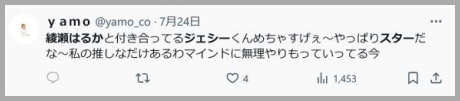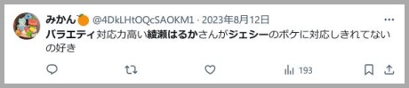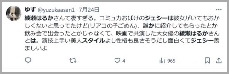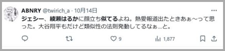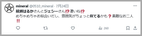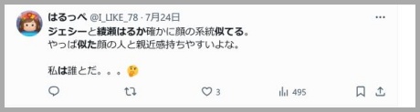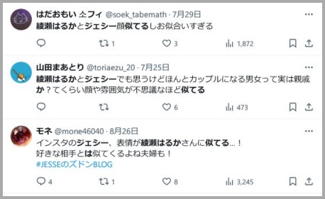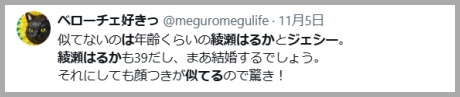 Xでは綾瀬はるかさんとジェシーさんのお顔が似てるという声が多数寄せられていました。