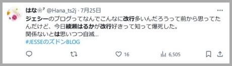 この「文章に改行が多い」という特徴は、ジェシーさんと綾瀬はるかさんの似てるポイントと言えるでしょう。