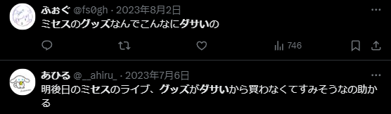 ミセスは精力的にライブ活動をしており、毎回グッズを販売していますが、「ダサい」というファンの声が多数見受けられました。