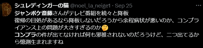 これは、斎藤さんの活動休止が「当面の間」と期間が明確にされていないことや、全レギュラー番組から一斉に降板したという事実から推測されているようです。