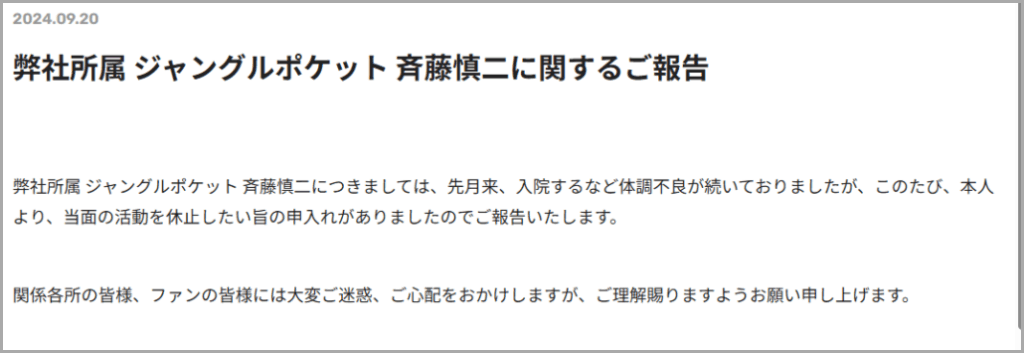 斎藤さんは2024年9月20日、所属事務所の吉本興業を通じて活動休止を発表しました。